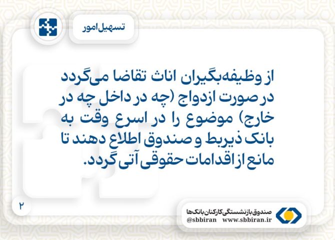 از متقاضیان برقراری حقوق وظیفه تقاضا میگردد پیش از سررسید برقراری حقوق، کلیه مدارک مربوطه را جهت پایش سالیانه به بانک ذیربط ارائه نمایید
