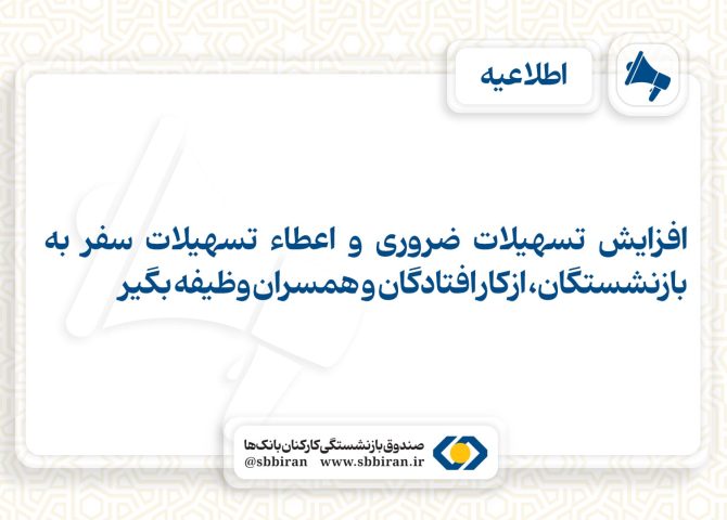 صندوق بازنشستگی کارکنان بانکها ضمن قدردانی از همراهی همیشگی مشترکین گرامی به اطلاع میرساند تسهیلات ضروری از ۵۰۰ میلیون ریال به ۸۰۰ میلیون ریال افزایش یافت. همچنین در راستای ارتقاء و توسعه خدمات رفاهی، تسهیلات سفر به مبلغ ۱۵۰ میلیون ریال نیز در نظر گرفته شده است.