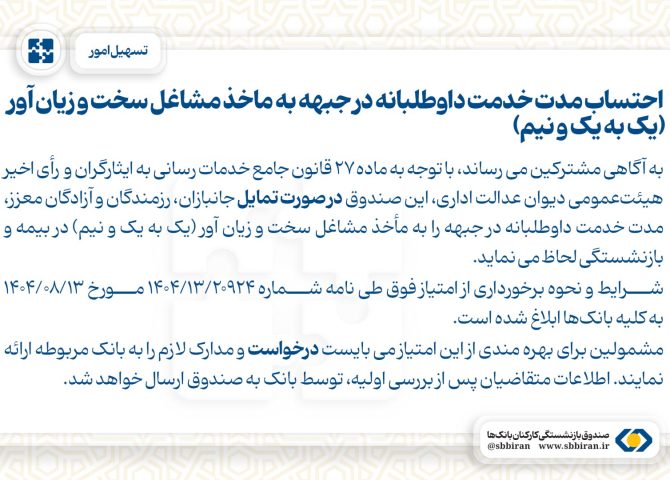 به آگاهی مشترکین می رساند، با توجه به ماده ۲۷ قانون جامع خدماترسانی به ایثارگران و رای اخیر هیئتعمومی دیوان عدالت اداری، این صندوق در صورت تمایل جانبازان، رزمندگان و آزادگان معزز، مدت خدمت داوطلبانه در جبهه را به مأخذ مشاغل سخت و زیانآور (یک به یک و نیم) در […]