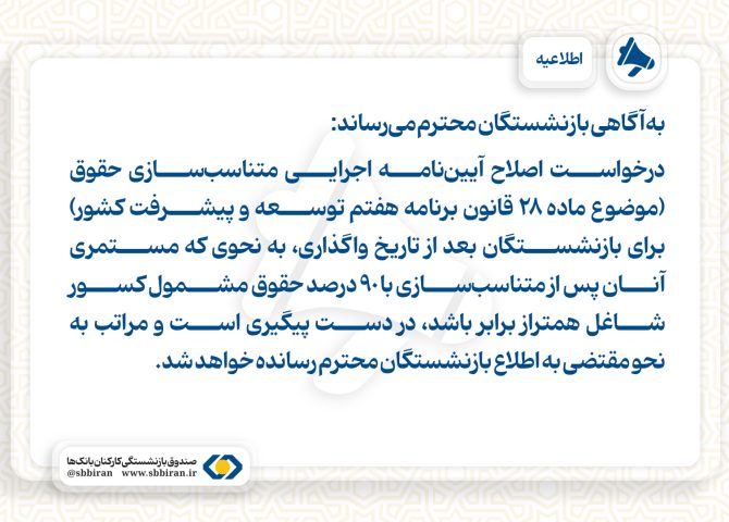 به آگاهی بازنشستگان محترم میرساند:درخواست اصلاح آییننامه اجرایی متناسبسازی حقوق (موضوع ماده ۲۸ قانون برنامه هفتم توسعه و پیشرفت کشور) برای بازنشستگان بعد از تاریخ واگذاری، به نحوی که مستمری آنان پس از متناسبسازی با ۹۰ درصد حقوق مشمول کسور شاغل همتراز برابر باشد، در